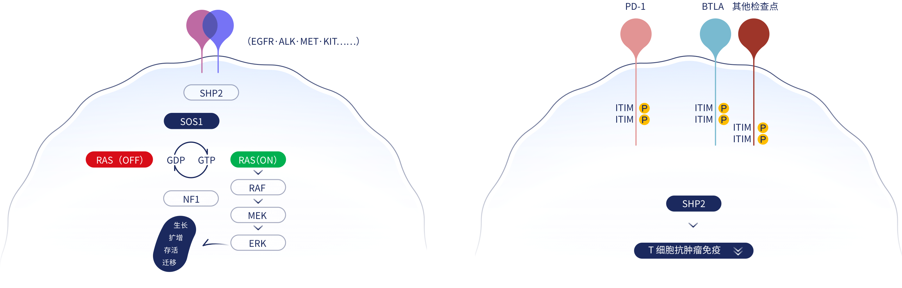 SHP2,也称为PTPN11,是一种磷酸酶,能够对底物蛋白去磷酸化,是调控细胞功能的重要分子。在RTK通路中,SHP2位于RAS上游,介导肿瘤增殖; 同时SHP2位于免疫检查点PD-1的下游,抑制T细胞抗肿瘤作用;还处在CSF-1R下游,促进肿瘤相关巨噬细胞功能。因此,靶向SHP2可起到多重抗肿瘤作用。