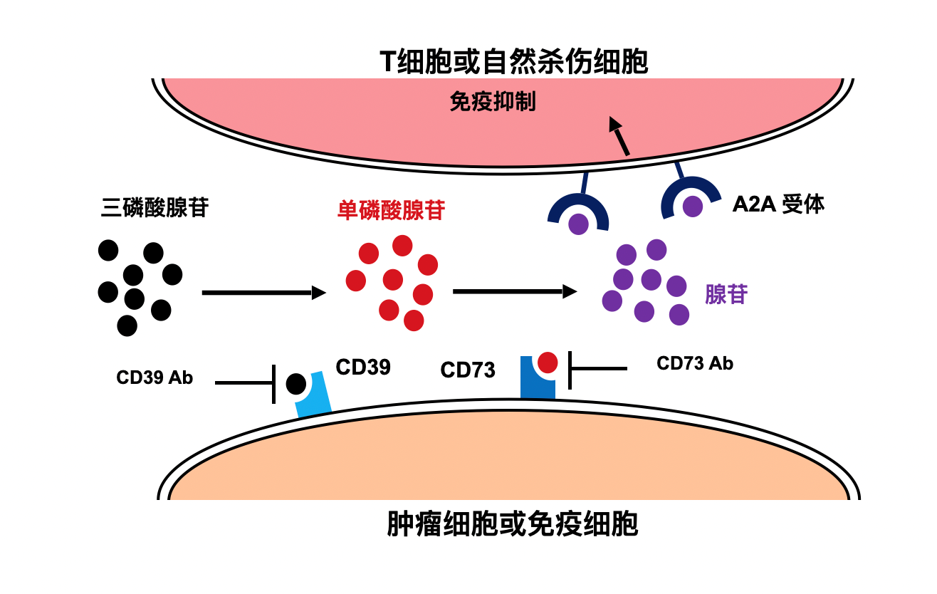 CD73又称作胞外-5′-核苷酸酶(Ecto-5′-Nucleotidase),是一种细胞表面酶,广泛表达于人体内皮肤细胞、淋巴细胞、Treg等细胞表面。CD73是肿瘤腺苷通路上的重要靶点,目前全球尚未有该靶点药物上市。