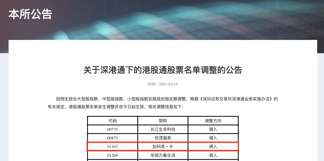 深圳交易所于2021年3月15日公告称,加科思(1167.HK)调入深港通下的港股通交易名单,2021年3月15日起生效。